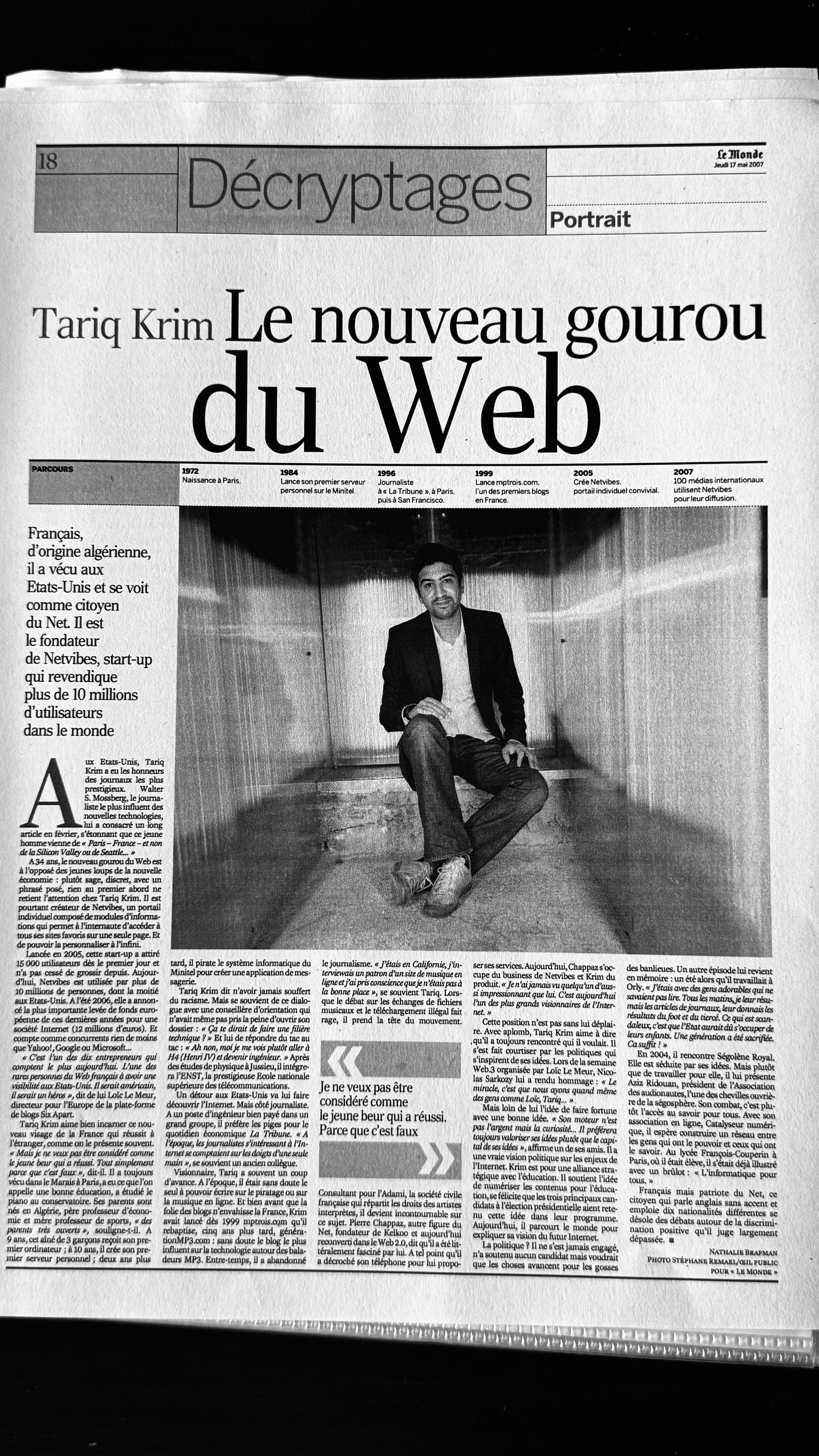 Notre rupture avec les conventions de ce que devait ĂȘtre une start-up a suscitĂ© beaucoup dâintĂ©rĂȘt aux Ătats-Unis. En France, je mâefforçais dâinsuffler dans Netvibes une vision proche de celle que jâavais apprise Ă Mountain View, avec un twist de produit et de design trĂšs parisien, et une volontĂ© dâembrasser le monde dans sa totalitĂ© et sa diversitĂ©. Je croyais que chacun a son propre chemin culturel et informationnel Ă cultiver et que la personnalisation constituait la valeur Ă long terme du produit.