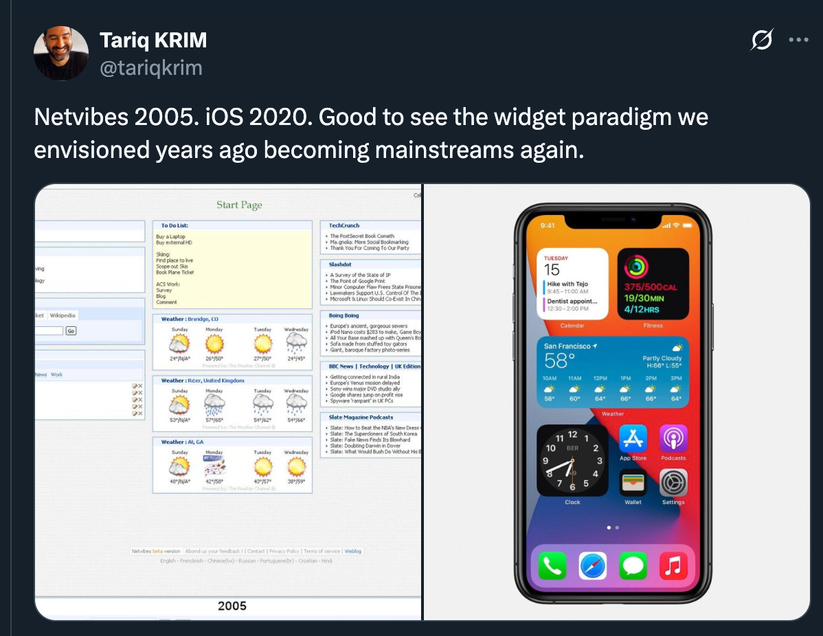 MĂȘme si câest un peu ce quâon retrouve aujourdâhui sur lâiPhone, lâidĂ©e de rendre Ă lâutilisateur le contrĂŽle total de sa vie numĂ©rique Ă©tait addictive. Google et Microsoft avaient leur propre « Netvibes », mais centrĂ© sur leurs services. Pendant ce temps, Netvibes se diffusait viralement aux Ătats-Unis.