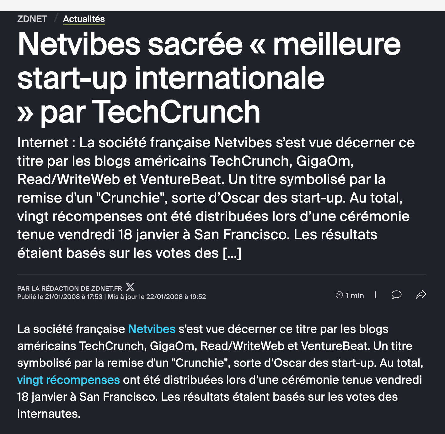 Netvibes a reçu lâun des prix les plus prestigieux de la tech, les Crunchies Awards, en remportant la catĂ©gorie start-up internationale.