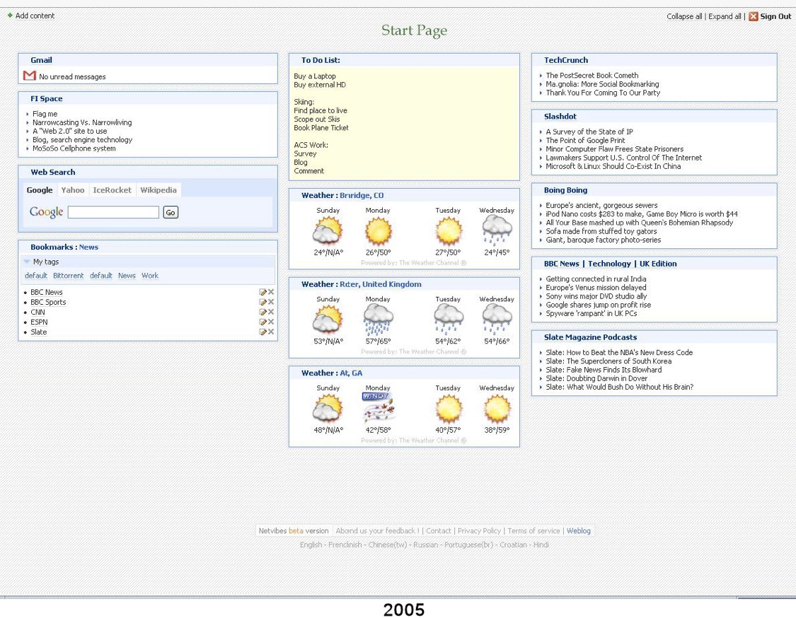 Netvibes a lancĂ© la premiĂšre page dâaccueil personnalisable par chaque utilisateur, trĂšs simple Ă configurer. Il sâagissait de permettre aux utilisateurs de choisir prĂ©cisĂ©ment ce quâils voulaient et de leur donner un contrĂŽle total de leur environnement. Chaque utilisateur avait une page diffĂ©rente et unique.